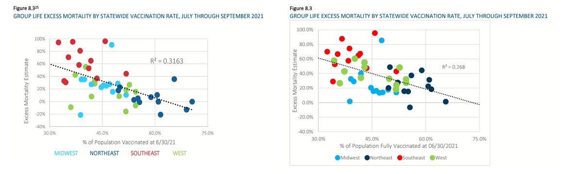 This is the first Group Life survey where we've been able to compare state level vaccination rates to the state level mortality percentages. And the data that we've looked at would have been percentage that were fully vaccinated by state as of June 30th, and we've compared that to the Q3 excess mortality by state, and we do indeed see that there is a moderate correlation—it's a negative correlation. So, those states having the higher vaccination rates showing a moderately lower excess mortality. And the R^2 correlation coefficient that we've seen is in the 0.32 to 0.38 range…