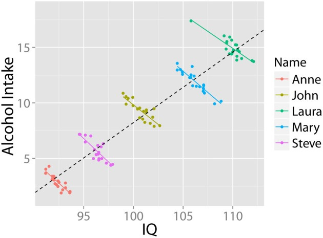 In this fictional toy example of a Simpson's paradox, the overall trendline suggests a correlation between higher alcohol intake and higher IQ. Before we cut to the chicken-and-egg problem (IQ = money = access?, drinking enables creative work?), we examine the coloring of the dots, which removes a confounding variable. For each individual in the hypothetical study, we see a negative correlation between IQ and alcohol intake (which makes sense for those and only those who are unfamiliar with well aged highland scotch, ahem).