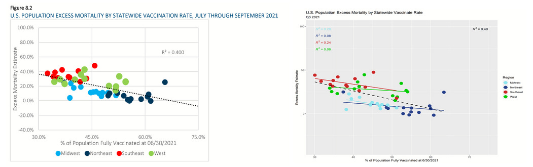Here is the 3Q 2021 excess mortality data (SOA's on the left, ours on the right). Note that our R^2 is identical to theirs, and our overall trend line (dashed) has almost the exact same slope and intercepts. Our dots are placed slightly differently, but it's clear that the data hasn't changed all that much between the data pulls. We made our dots a little smaller than beach ball sized so that none of them get hidden behind the others.