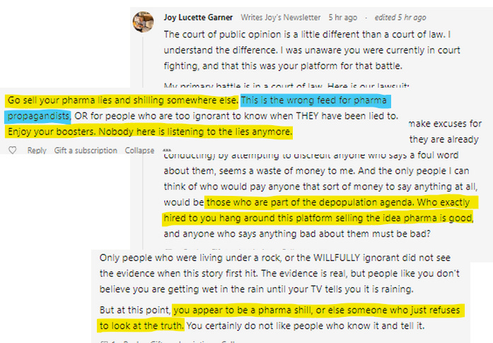 But there, I've expressed my outrage. And better, I didn't aim it wildly at people I didn't know on the internet. But here is an interesting sample of Joy's (which is apparently a researcher of some kind) comments toward me.