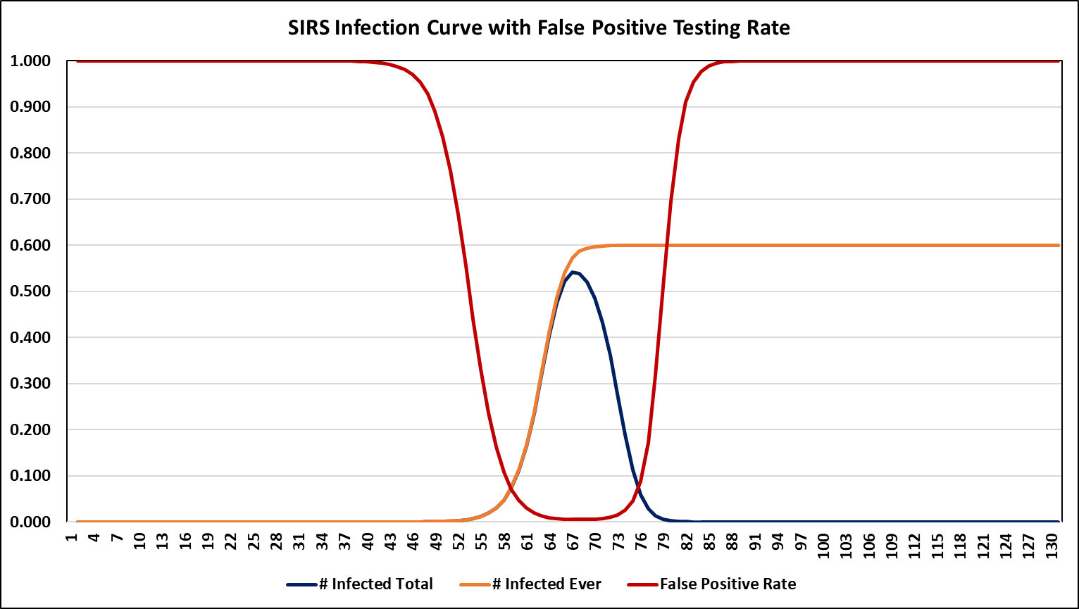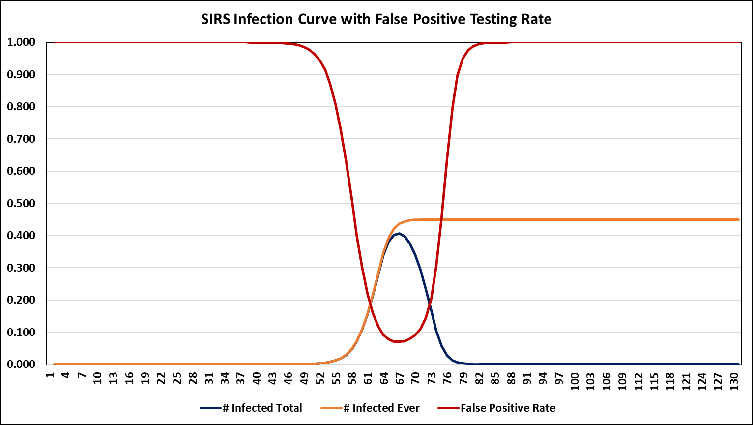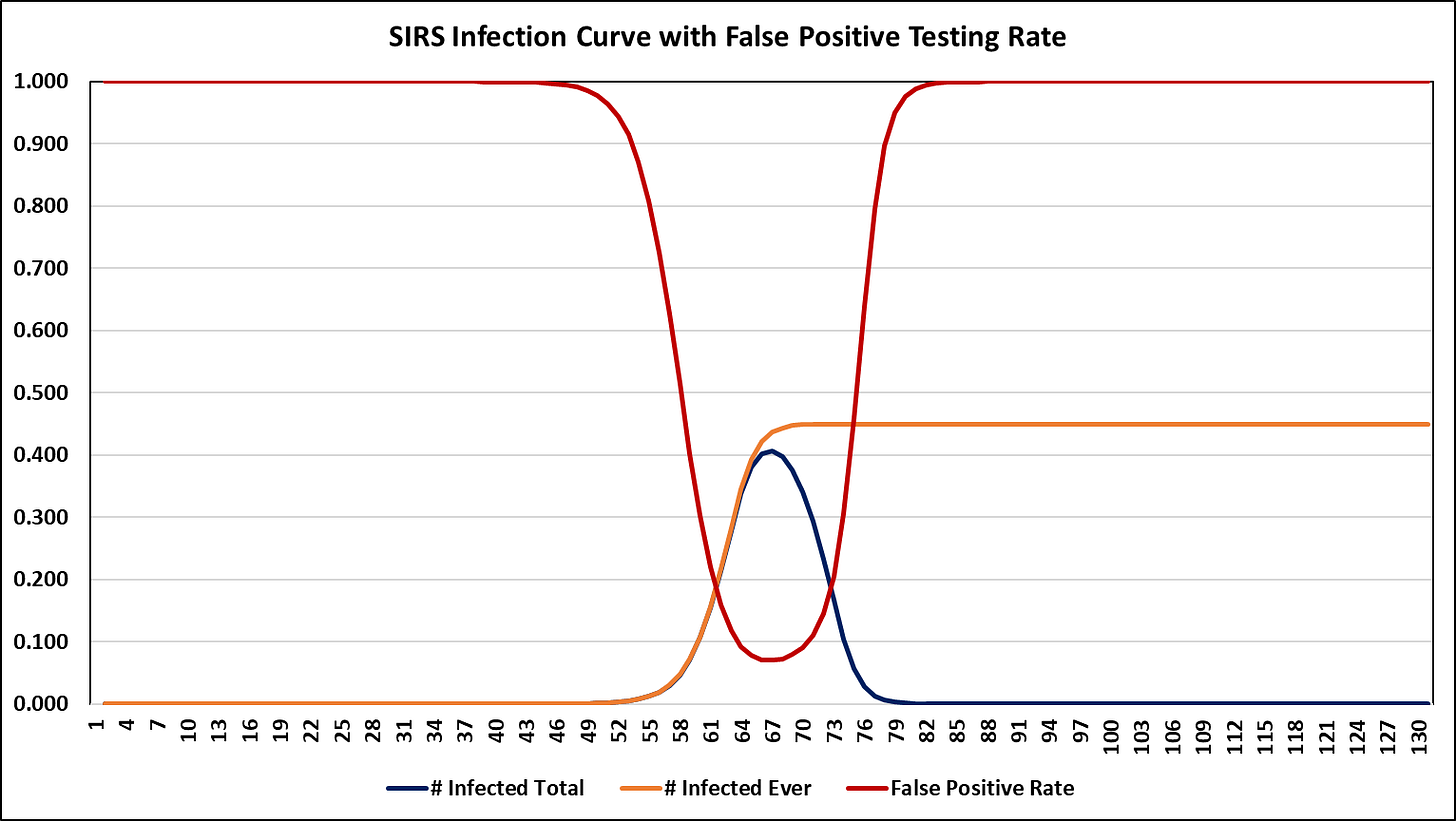Let us dispense with any discussion of the limited use of SIRS and other models that have varying levels of conformity to reality. We all know that the map is not the terrain. The purpose here is simply to examine what happens to false positivity rates during an epidemic, and the range of the false positive rates is the same for any epidemic that starts at 0 infections and peaks at the same levels as our graphs.