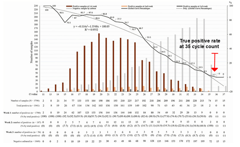 The 97% number comes from a paper (Jaafar et al, 2021) at the high PCR cycle count of 35, meaning the process of replicating each genetic sequence swept into the PCR process is doubled 35 times. An off target amplicon might be swept up at any point in the process, so maybe it gets double 19 times at which point one individual sequence of nucleotides results in a total of 524,288 strands, which is quite measurable. But even the intended target amplicon gets ratcheted up to around 34 billion strands. So, some tiny amount of virus that a body is successfully fighting off, or even some artifact strand from a prior exposure