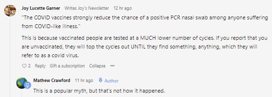 Note, this is the extension of the first thread about whether those who are vaccinated and those who are unvaccinated were ever tested using different cycle count thresholds. That certainly did not happen during the trials (by any documentation I have seen, including links she provided). What did happen was that after Biden came into office, the cycle count threshold for virus detected in the vaccinated was lowered (to 28 IIRC) for the purpose of choosing those sample sent for full genetic sequencing. This is distinct from the use of PCR as a broad diagnostic tool, though I have seen the claim made and propagated that testing surveillance was distinguished in this way. That strikes me as disinformation or misinformation, and our community that is resisting authoritarianism should be careful about how we communicate facts, and sometimes take some time to give more complete explanations in order to limit confusion. Further, people of good faith who find that they were confused should then learn to dig deeper and have discussions with more people to seek greater understanding before pushing what could be mis/dis-information.