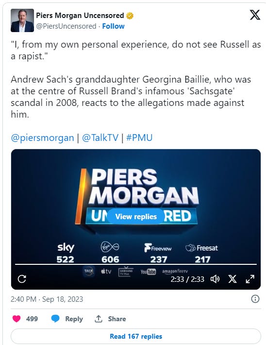 Piers left out a key part of the context of Georgina's full commentary (which was quite reasonable, IMHO). What she said was (bolded is the dropped part), "I, from my own personal experience, do not see Russell Brand as a rapist. However, a lot of the evidence is very compelling, so one has to keep an open mind." Georgina expressed the opinion that the police should investigate, that she wants Russell to continue on a path of recovery [from addiction], and that his accusers should be believed. That last part did not sound as though she meant their story convicts Russell, but that the women should be taken seriously in walking through the process of having their story evaluated. But Piers picked a phrase that, removed from context, a Twitter reader might see, evaluate the statement as one of character exoneration, and then continue on with their doom scrolling. All I think Georgina really meant was that her experiences with Russell were consensual given that she made it clear that she cannot adjudicate the claims from her position.