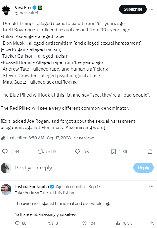 Many wise people follow a self-imposed rule of not commenting on such controversies surrounding initial allegations for 24 hours, if not three or seven days. Or…and this may sound strange…after doing enough research to feel comfortable that you've developed a reasonable range of the likely endpoint of a confluence of evidence and circumstances. Yet surprisingly strong opinions on Brand and the sexual assault allegations in particular were instantly abundant a mere 82 seconds after allegations hit the air waves.