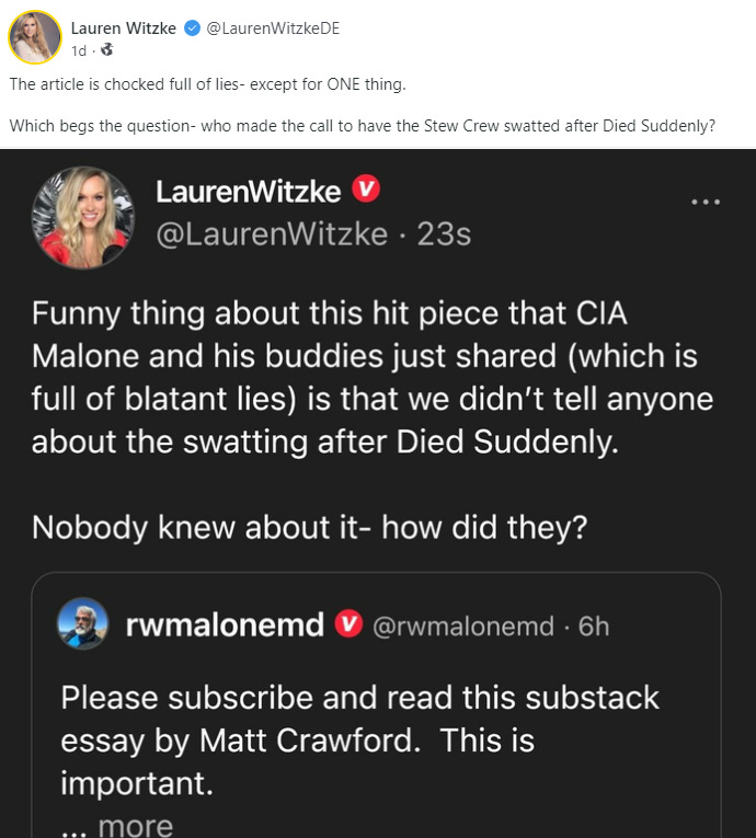 Huber calls out Malone's critique of Died Suddenly as "this unsubstantiated smear piece" and challenges him to a debate. I'm certain this won't reach the top of his priority list. But I offer to step in for a friendly debate with Colleen. Rounding the Earth is happy to broadcast it. In fact, Rounding the Earth is going to host a Roundtable discussion at 1 PM Eastern on Tuesday, December 13, livestreamed to Rumble and Rokfin (maybe elsewhere), to discuss Died Suddenly. I hereby invite any and all of the following people to participate. Please email me at mathew.crawford@protonmail.com to RSVP.
