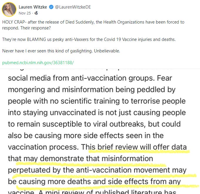 Obviously Stew Peters is styled as a right-wing commentator whose audience leans heavily Republican. I wasn't going to talk about that initially, but it was brought to my attention that Lauren Witzke jumped into the ring. While she is not listed on Died Suddenly's IMDB page, the documentary is listed on her IMDB page along with the Stew Peters Show. She is the President and Producer of the Stew Peters Show.