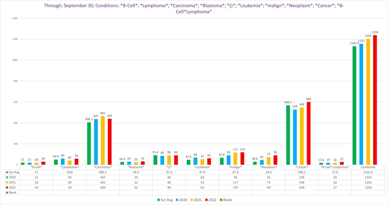 There is a further, additional uptick in 2022. This is already alarming! But the data would look far, far worse if there were a 300% increase in (all neoplasms) cancer reports among any broad cohort.