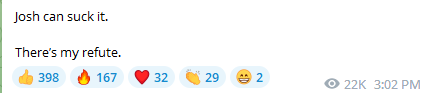 Steve has done some great work at times, but I think that whatever circle is actually steering his priorities kills his effectiveness with the MFM on a Big Picture level, and I don't know how to help him understand that. He has soaked up the audience, but I suspect that's almost entirely the Choir at this point. (After consulting for him on cryptocurrency trading and investment in March/April, telling him unequivocally that success with his trading algorithms would require recognizing that "[Crypto] Winter is Coming" and pulling out from essentially all altcoins and exchange risk, he lost a serious pile of money in the FTX-A debacle—enough to make over 100 documentaries—so I'm guessing that for whatever reason he cannot see me as somebody worth listening to no matter how close we get to my primary professional domain.)