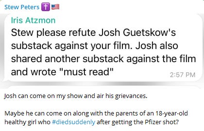 Other than not thinking Stew Peters should be a focal point for the Medical Freedom Movement (MFM), anything else involving science, or any ecosystem that includes people with anger management issues and access to sharp objects? Because investigating the world's largest ever fraud seems like a reasonable priority, and we have a soft target. Repeat after me: