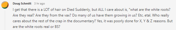 Moments like this in the documentary allowed Dr. Susan Oliver to look basically competent for almost an entire video. I tried to engage Dr. Oliver about the DMED story. After all, her Twitter profile advertises her as a "Scientist who is passionate about correcting misinformation", and she reasonably identified some of the mistakes made in Died Suddenly. Strangely, she or YouTube seems to have deleted my comment on her video about the DMED data (it around 30 seconds), and is ignoring my request on Twitter to discuss the details.