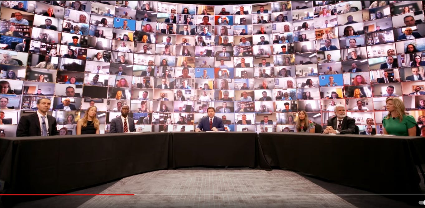 The image of this talk is a powerful one, with scores of doctors and scientists on screens ready to speak or willing to lend their weight to the message. It amused me to recognize a scientist I know whose home I was in last week sharing data work.