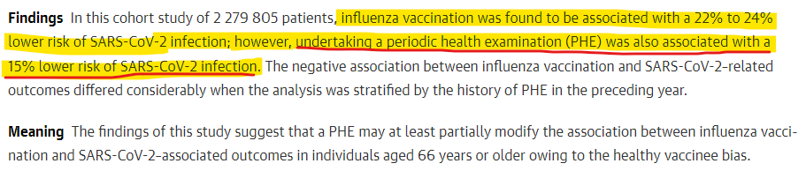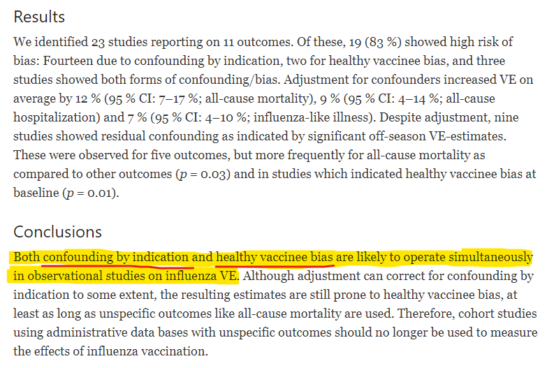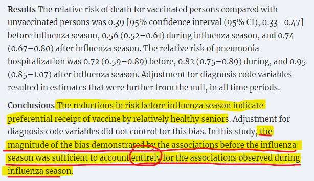 Contrast this with a similar study finding similar raw VE results (Nichol et al, 2007) that admonishes other research that, "may provide misleading pictures of long-term benefits, and residual confounding may have biased past results," without itself identifying HUB effects. The paper does report a sensitivity analysis on the aggregated data to show how a confounder might lower VE, but as a professional Biostatistician would tell you (none were on that paper), that necessarily runs afoul of something called the ecological fallacy as the VE for the disaggregated age bands were wildly different. The authors of this study do pat themselves on the back for working with long-term data sets.