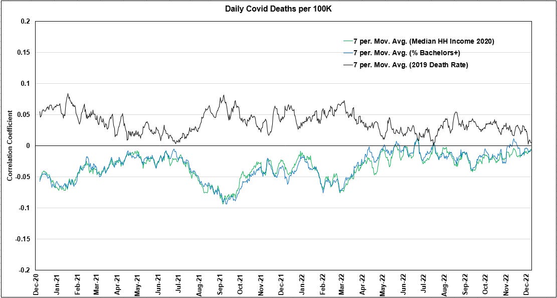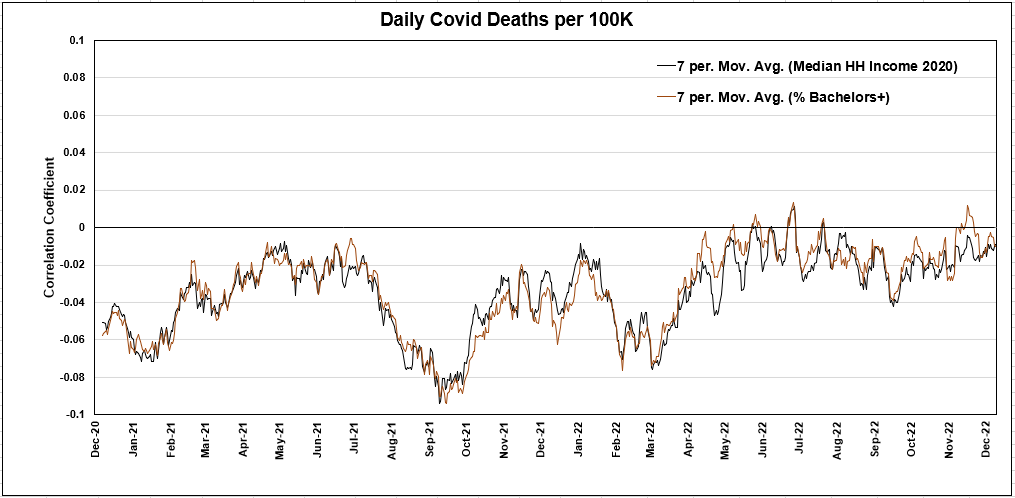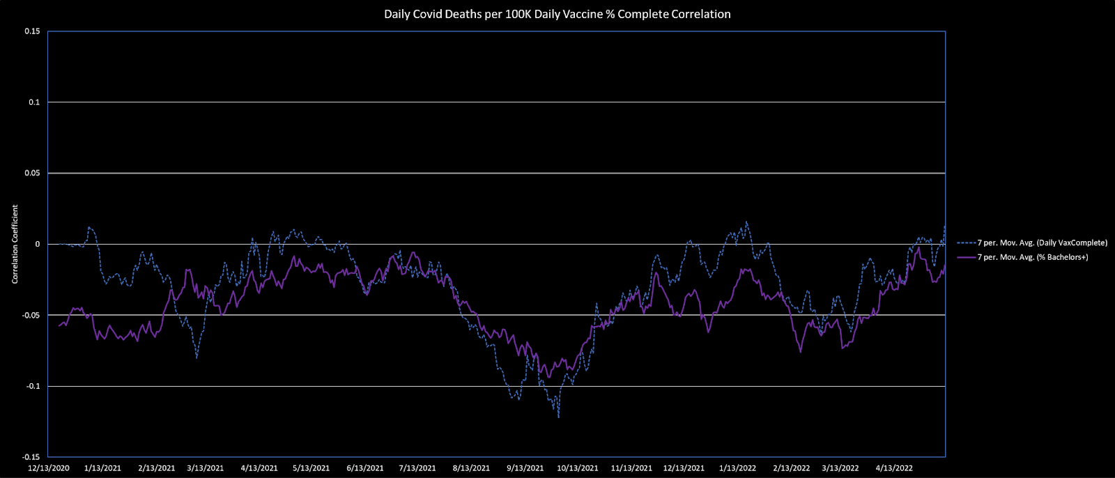 Note that in the data set I'm using, from December 13, 2020 to May 12, 2022, the correlation between median household income and % of the residents of a county with a bachelor's degree is 0.71. That's extremely high considering divergent factors such as people with college degrees in nursing homes, or exactly how impoverished the people below the median income might be—is there a homeless shelter in this zip code? Clearly wealth and health are highly related, thus WUB and EUB are highly related.
