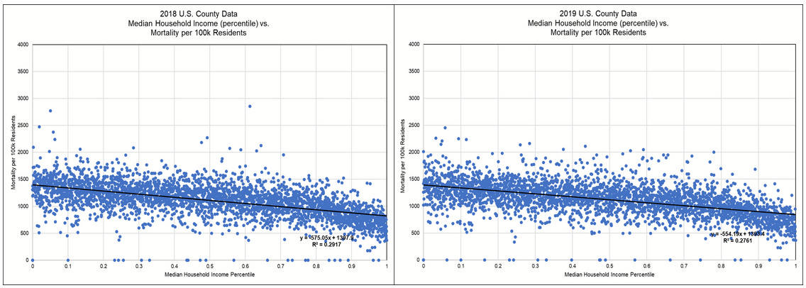 These scatter plots from 2018 and 2019 (pre-plandemonium) show that greater household income is associated with around a 40% county-level mortality rate reduction (maximum to minimum). And clustering around the trend lines is tight.