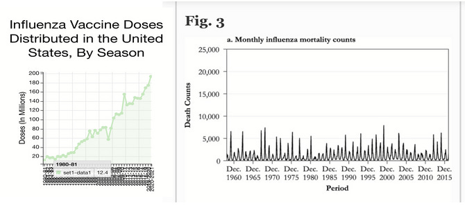 This really doesn't look good for the vaccine pushers who are likely aware of every bit of data that I have showing HUB = VE, and plenty more. What looks even worse is a side-by-side comparison of annual flu vaccine doses and incidence of influenza mortality.