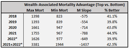 During the pandemic era, the wealth advantage is slightly larger than during the immediately preceding years. Within the pandemic era, it grew during 2021, but retreated substantially in the partial data set of 2022 (which includes data through June 7, so I projected it linearly to a full year). The least wealthy counties suffered significantly worse excess deaths during the plandemonium. However, in 2022, mortality in the wealthy counties was still growing (at least through May 12), while the mortality in the least wealthy counties had finally begun to revert (hopefully a continued trend).