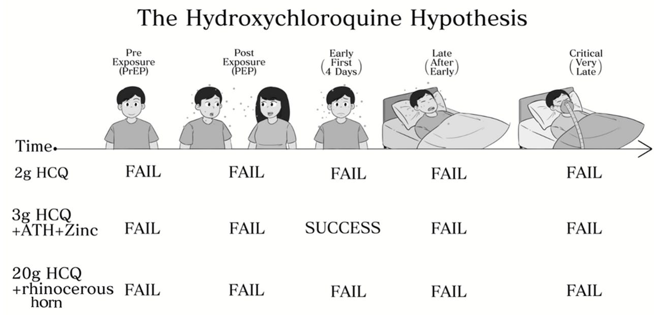 The Hydroxychloroquine Hypothesis: That there is some appropriate dosage of hydroxychloroquine, alone or in some combination with other medication, that successfully prevents some COVID-19 cases (PrEP/PEP) or treats some COVID-19 sufferers (Early/Late/Critical).