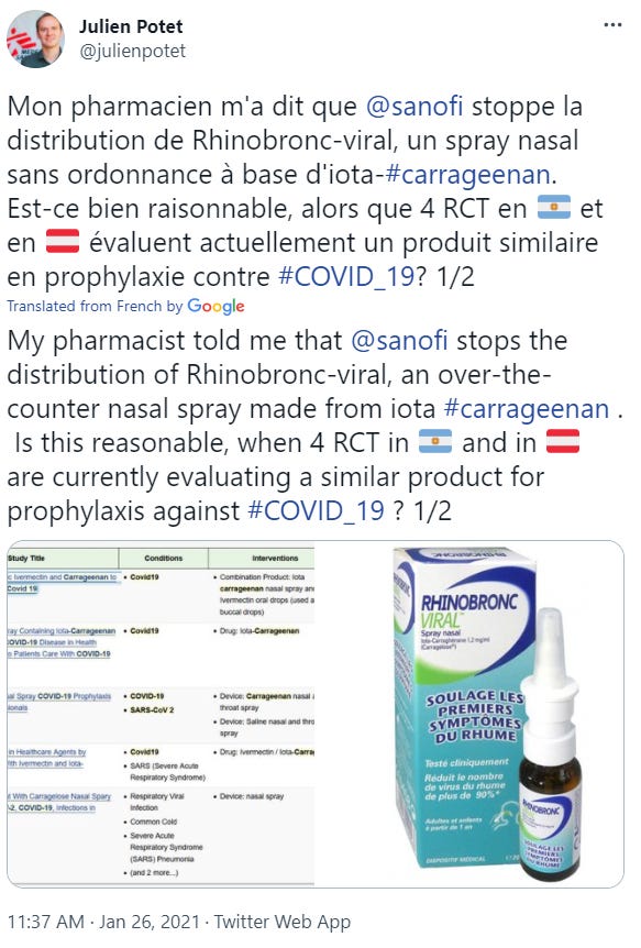 Recently, numerous nasal sprays (here and here) have begun to show results in preventing infection. One way to toss that conversation down the memory hole is to just stop producing them.