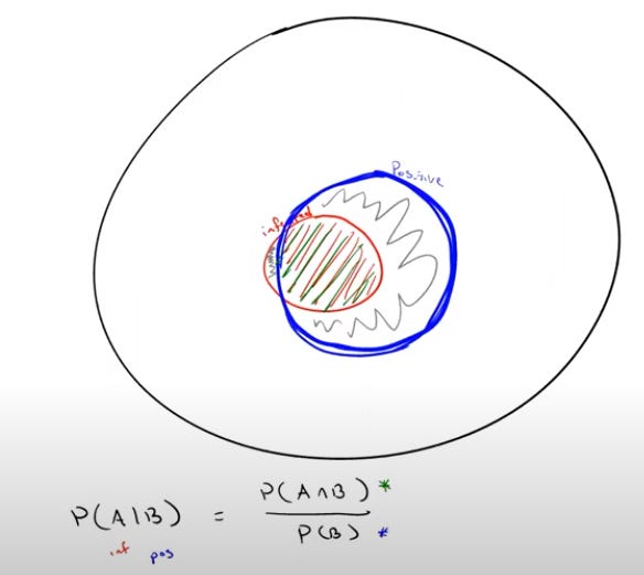 The population is in the large (black) circle, but the total population of the city of Madison becomes irrelevant the moment we declare a positive test took place. That "conditional" statement of a positive test result means that we are now only examining the part of the population of Madison that tested positive---those in the blue circle. The probability that we are looking for is the portion of that population that is also in the red circle (the infected population) that partially intersects the blue circle. Now our logic reduces to understanding Venn diagrams and proportions of (population) sizes (discrete, but almost like areas in circles if we draw them well enough, which I don't).