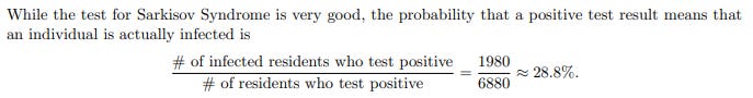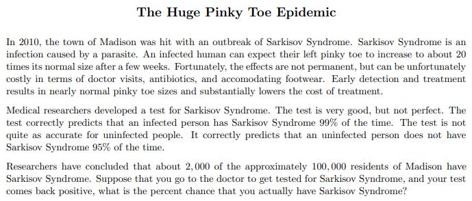 After the students read the problem and context, we discuss what it would be to walk around untreated, with a "baby" toe bouncing (THU-THUD-THU-THUD) like a basketball. Next---and before walking through the problem of finding the probability that somebody who tested positive indeed has Sarkisov Syndrome (SS)---I ask students to write down their first guesses in their first seconds of thinking about the problem and hand them to me. I then read them out. Most all of them tend to be between 90% and 100%. Even those who guess lower are usually nowhere near the correct answer. In fact, I've even asked this problem in groups that include scientists, computer scientists, and math professionals and heard mostly answers that were not close to the correct one.