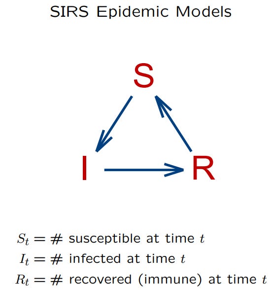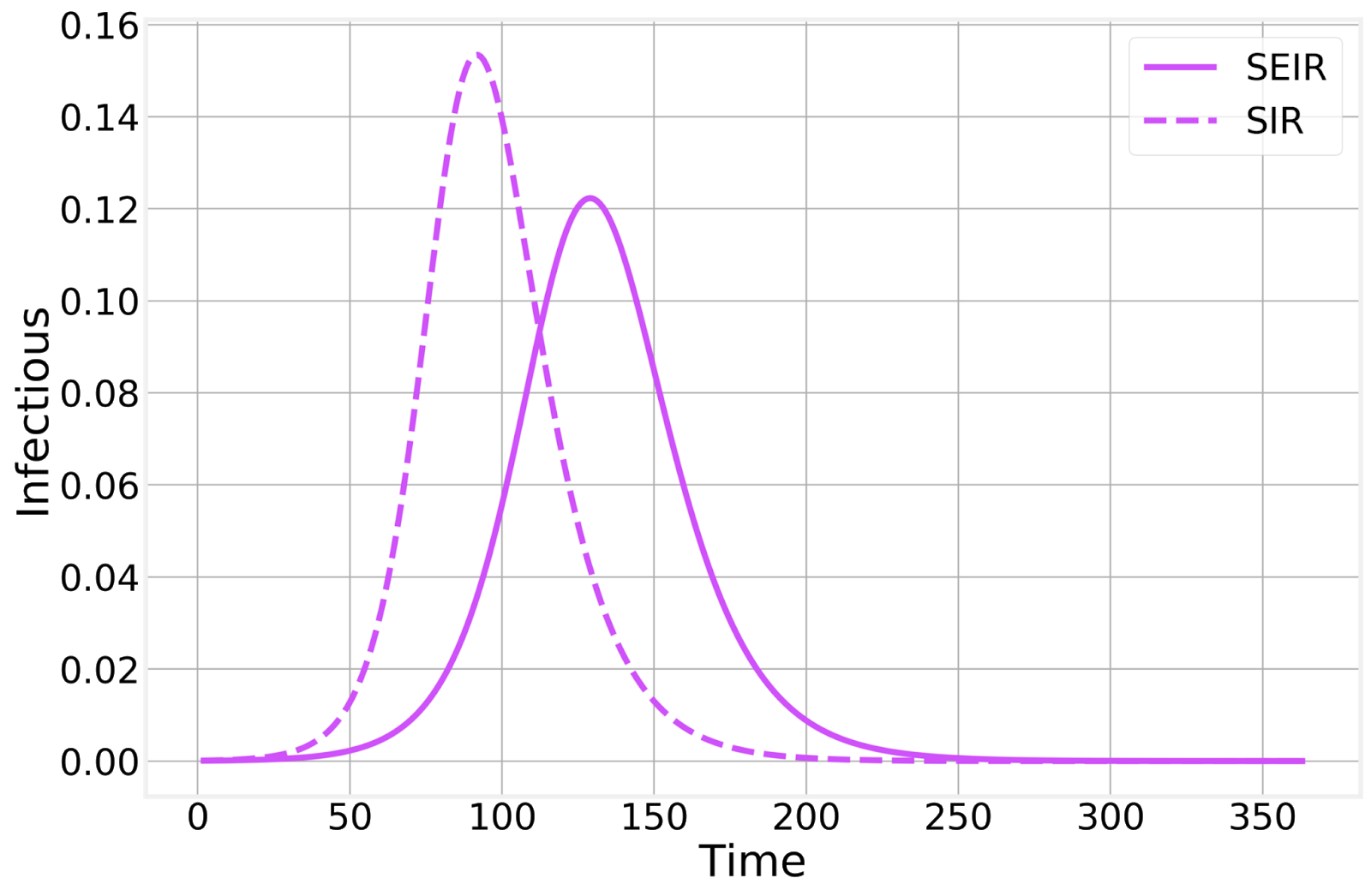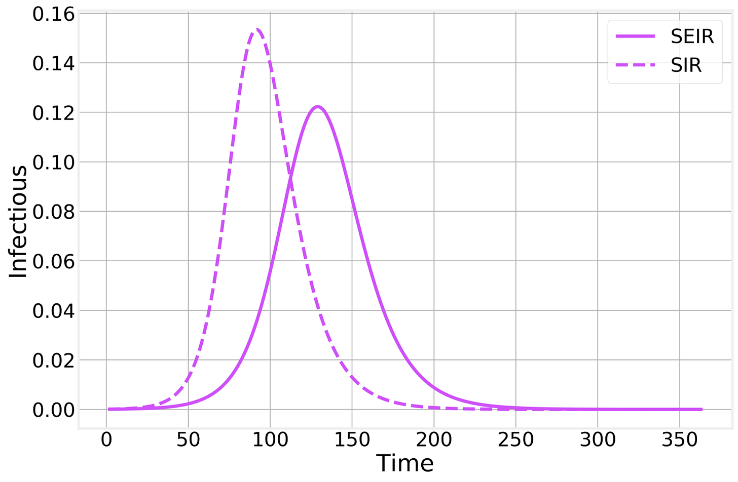 While technically, the math and modeling can get quite deep, including examination of population graph connectivity, stochastic (random) "superspreaders", decaying fractal patterns, and whatever other real-world toppings you want to pile onto that banana split, the primary epidemiological function has an image (output) that you've seen many times before. The SEIRS model adds an "exposed" population. These are not quite traditional bell curves (symmetric normal distribution) or sinusoidal wave, but shares some physical features with each:
