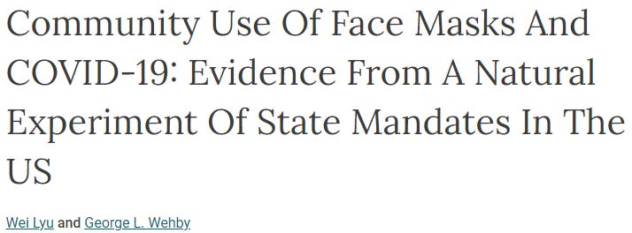 Lyu and Wehby are clear about the fact that they are unable to measure adherence rates. And if you read down into the McCoy article (same last link) on intention-to-treat analysis, the author points out that adherence to treatment historically confers additional unexplained benefits beyond either clinical or placebo effects. So far as I can tell after multiple readings, Lyu and Wehby make no mention at all of this effect, and perform no correction for it. Perhaps there is a level of conscientiousness among those who "take their medicine" that results in additional behavioral changes. People who take the step to "treat" an ailment often take additional steps which themselves contributed to the "truth" of the outcome. For instance, it is understood that Tamiflu works on only some influenza strains, but not others. Somebody who takes Tamiflu on day 1 of flu symptoms may also take multivitamins and eat chicken soup, one or the other of which might shorten flu duration (here, here, here, and here). Did somebody who took Tamiflu and had a short-duration flu benefit from the Tamiflu? Additional analysis would be required to separate all the variables. Could people in counties with mask mandates take more vitamin supplements, otherwise change their diets, have added UV light to their HVAC systems, or other precautions? The Lyu and Wehby study does not go far enough to make conclusions on that front. These effects may subsume the entire effect size of the study, meaning that nothing in this study necessarily measures the effects of masks at all.