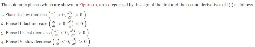 Here is a succinct description of the first derivative of an ideal (per wave) epidemiological curve/function: It starts at zero, gets big quickly, hits zero at the curve peak, then goes negative fairly quickly, then flattens out at zero at the end of the epidemic.