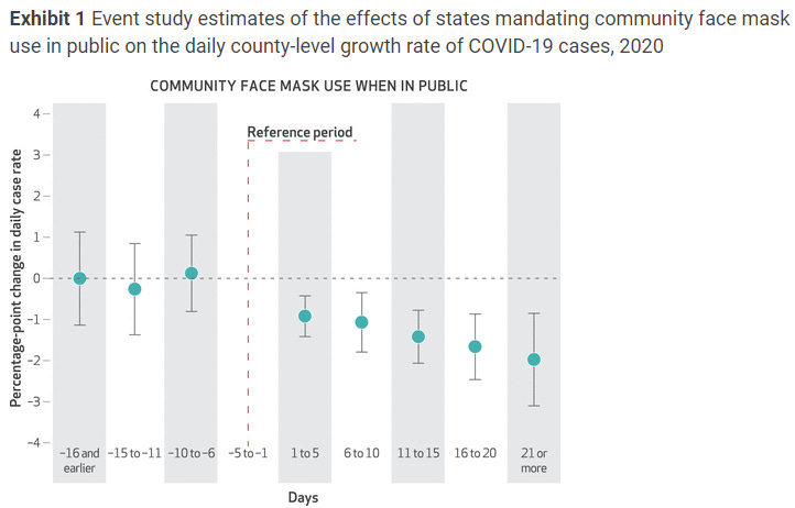 Next, I'd like to focus on the "Limitations" section of the study. A section like this should weigh in any reader's mind as attached to any evidence suggested in the "Conclusion". This section points out that the results of the study represent "the intent-to-treat effects of these mandates" and continues, "that is, their effects as passed and not the individual-level effect of wearing a face mask in public…" This is where we likely see the greatest amount of confusion, both among the public and among many articles and government sources I've seen cite this paper. This study does not purport to show that face masks are effective. In fact, that is clear in the Conclusion section, though readers unfamiliar with the terminology, or unaware that a study could say anything other than "masks work/don't work", may misread it: