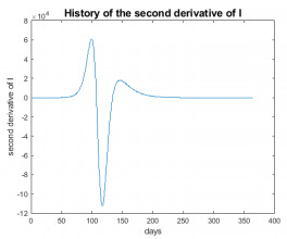 Note that the only time the second derivative is negative (Phase II above) is around the peak of an epidemic. Or we could say that the second derivative is "less positive" at the tails (start or end of a "wave"). Here is an example graph:
