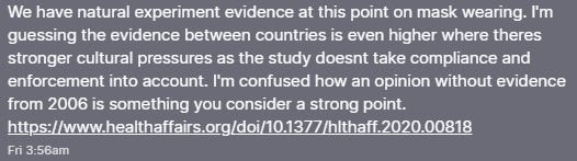 I will go ahead and say that at the outset of the pandemic, I knew nothing about debates and studies of mask usage in relation to virus spread. My first order common sense though was that they probably work just a little, and maybe the really good ones (N95 or better) worked moderately well. When I tried to read up on aerosolization there was sparsely little information that seemed useful (and I now recommend this Wired article that explains part of that story). So, as I'm sure is true for many people, my opinion on mask usage took shape slowly over several months. My opinion is now informed by several dozen studies, including the relative quality of study designs. In the meantime, I got to see a lot of debate online, some of which reached heated and sometimes mean-spirited proportions.