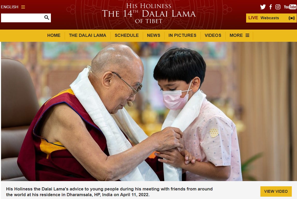 The Lamas almost never gave food to the poor, or otherwise raised them up. The arrangement was exactly the opposite. Millions of Tibetans raised food and livestock for the lamas and government class. The Tibetan doctrine of "altruism" was apparently taking care of the wealthy master class. Much of the rest was "rules for thee, but not for me." You can even see it on the front page of the Dalai Lama's very professionally produced homepage. I'm certain His Holiness thanked the child for protecting him with that mask, right?