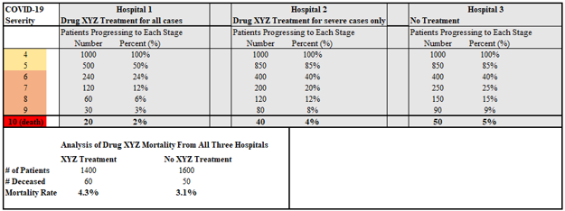 The following hypothetical, but realistic charts demonstrate the need for stratification of results. In our hypothetical, the drug XYZ is assumed to reduce mortality by 60% when given to patients upon reaching Severity Score 4 of the WHO’s ordinal scale, as we see in direct protocol-level comparisons of Hospitals 1 and 3. However, a naïve analysis comparing patients who received drug XYZ to those who did not would conclude that drug XYZ results in a 37% relative increase in mortality, as demonstrated shown in Figure 3.
