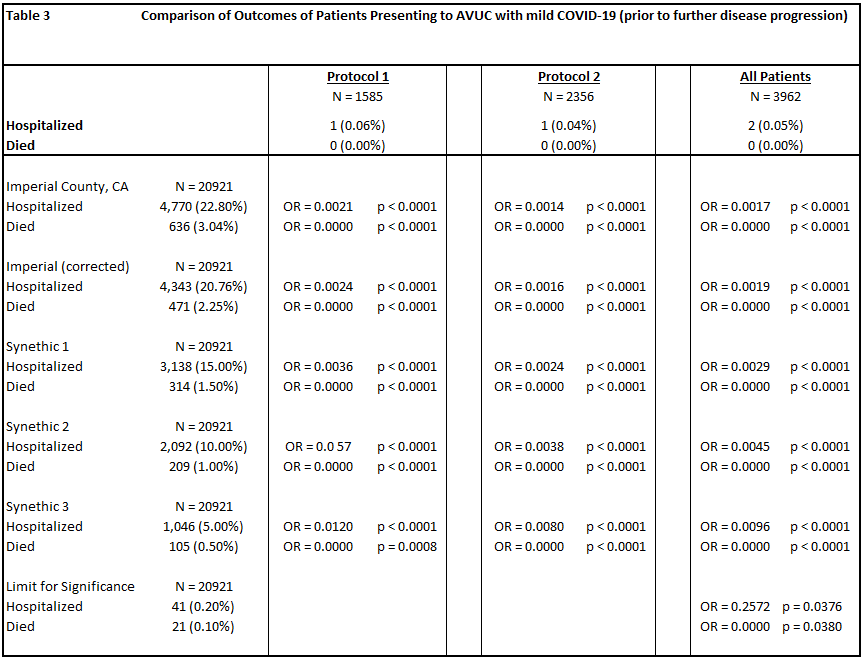 Of 1,585 patients treated for mild COVID-19 in Protocol 1, there was one hospitalization (0.06%) and zero deaths (0%). Of 2,356 patients treated for mild COVID-19 in Protocol 2, there was one hospitalization (0.04%) and zero deaths (0%). There were twenty-one patients whose date of treatment was obscured after data blinding, but were treated for mild COVID-19, all without hospitalization or death. In total, of 3,962 patients (Table 1) treated for mild COVID-19 by All Valley Urgent Care staff, prior to moderate or severe disease progression, there were two hospitalizations (0.05%, RR = 0.0019, p < 0.0001) and zero deaths (0%, RR = 0.00, p < 0.0001).