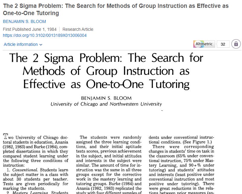 If you haven't heard of "the Benjamin Bloom problem" or the "two-sigma problem [of education]", you're far from alone. It's kind of like not knowing in April 2020 that SARS-CoV-2 is weak sauce with lots of early treatment options. The topic should be among the world's highest priorities until it is understood and agreed upon by essentially everyone. It's that basic and foundational, and the only reason most people aren't aware is that it gets in the way of the obedience model of education, which powerful forces align to keep in place.