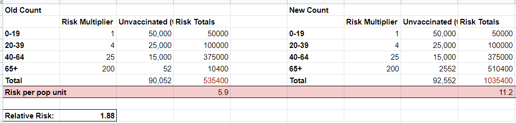 I built a quick simple spreadsheet to relate the point. I did not dig up current risk-stratification to be fully precise, but if you've seen those charts, you know I'm not way off here. What we see is that the risk-profile of the unvaccinated cohort in this grand experiment just nearly doubled: