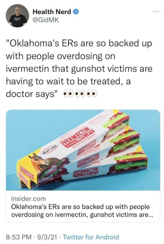 Further demonstrating his clear good faith in checking the evidence, Health Nerd was among those completely drawn into the medical-partisan warfare over the strange tale of IVM overdoses filling ER rooms in Oklahoma. I kept wondering who would even believe such a story, but this answers that question.