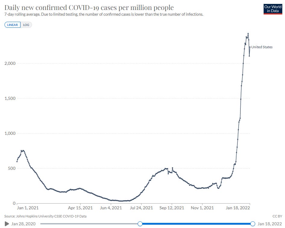 And by "officially" I don't mean that the WHO said so (though they might have…I haven't bothered to check because why would I?), but rather "look at the charts!" In fact, there are almost no deaths at all associated with the omicron variant! Of course, there will be some. There is no such thing as a respiratory infection that doesn't kill some of the frail elderly. But unless there is some facet of the omicron outbreak that we don't yet understand, this is all extremely good news. In fact, it's such good news that we should probably declare the pandemic over with and stop talking about vaccine mandates and passports altogether.