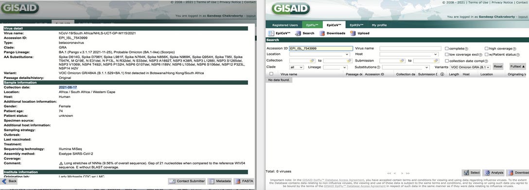 However, an omicron sample (EPI_ISL_7543999) was collected no later than June 17, 2021 from a 73-year-old woman in Western Cape, South Africa. Then, in December, that record was deleted from the GISAID database (hat tip Sandeep Chakraborty).