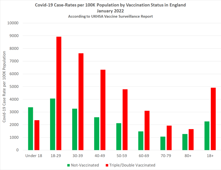 The normalized data from the United Kingdom shows the vaccinated suffering from COVID-19 around twice as much as the unvaccinated during the Winter wave: