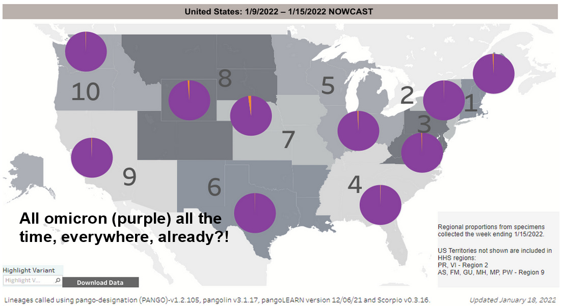 I do not and have never believed that the omicron variant just came in and WHOOSH took over the whole world including every cupboard in every remote farm and fishing village in the swift blink of an eye as CDC surveillance models and covariant.org would have us all believe. From 0% at the end of November to 88% on January 10 (actually, that was a running two weeks calculation…the CDC thinks >99% now)?!