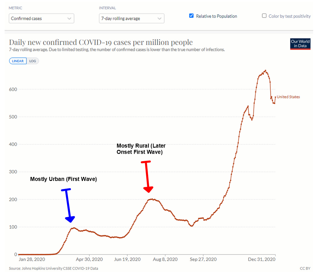 When SARS-CoV-2 first swept through the U.S., the "first wave" appeared as two waves of somewhat distinct geographical characteristics. The virus first hit large urban population centers with substantial volumes of international travel, and also Andrew Cuomo. Somewhat later during the summer, SARS-CoV-2 hit Mississippi, for instance.