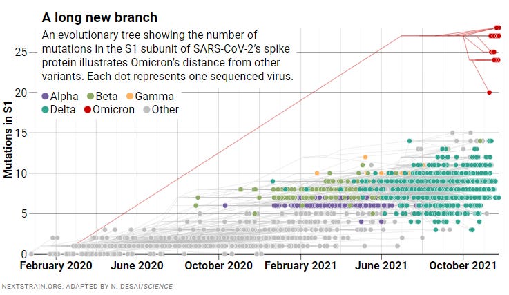 Eugyppius, whose substack I greatly enjoy and find consistently educational, hypothesizes that omicron was leaked from a laboratory, which is one way to explain why it looks like a mid-2020 branch of the SARS-CoV-2 phylogenetic tree.