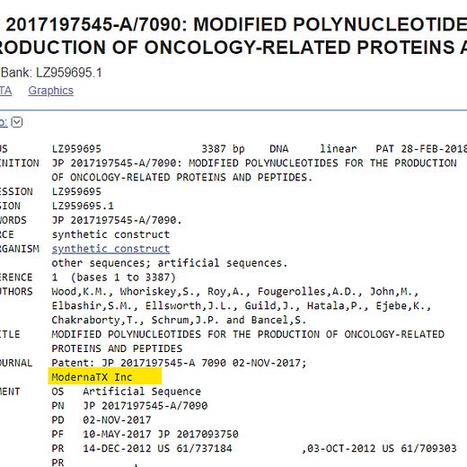 For those still harboring dissonance over the possibility that this entire pandemic was the outcrop of gain of function research, understand that sleuths have matched a 19 nucleotide sequence between SARS-CoV-2 and a sequence in a Moderna patent.