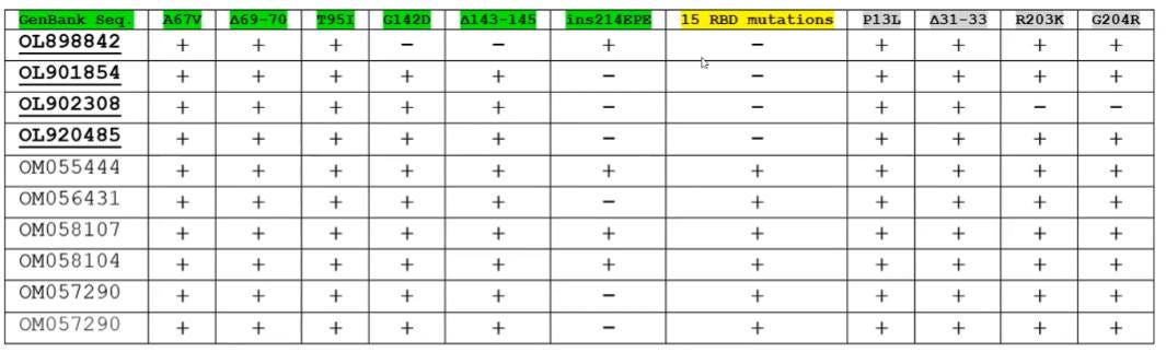 Here is an example of sequences in GenBank identified by Dr. Henry Ealy. All are identified as omicron even though the first four do not have the receptor-binding domain (RBD) mutations that define SCO.AB.1 and SCO.AB.2: