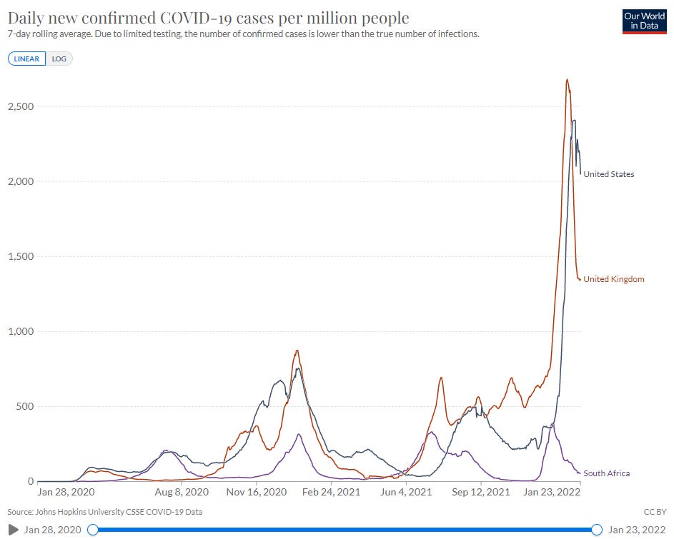 But this dip-and-surge is something different. These waves represent not two different geographies, but two different strains. What this tells me is that the human terrain may unfortunately be treating these highly similar strains as if they are essentially different in nature. That would really not be good. Hopefully Team Omicron will continue to put far fewer people in the hospital per infection, than Team SARS-CoV-2 did.
