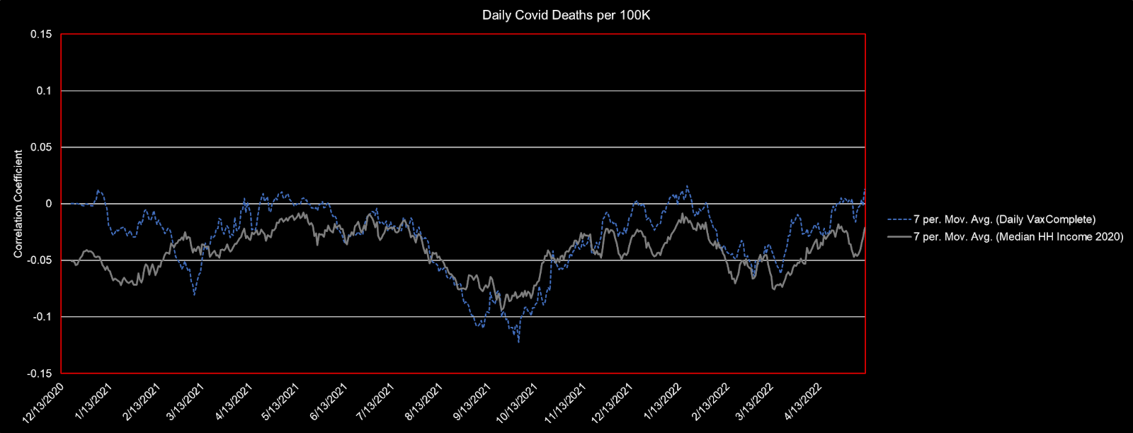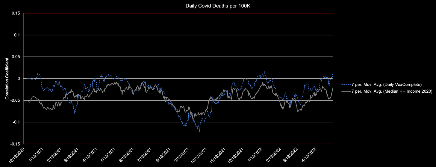 When looking at signals of vaccine efficacy (VE) in U.S. county data, we find that median household income almost perfectly tracks (and usually outperforms) vaccine status as a determiner of who dies from COVID-19. In fact, more income seems to be more protective from COVID-19 for a county than vaccines. Maybe lockdowns weren't such a good idea…