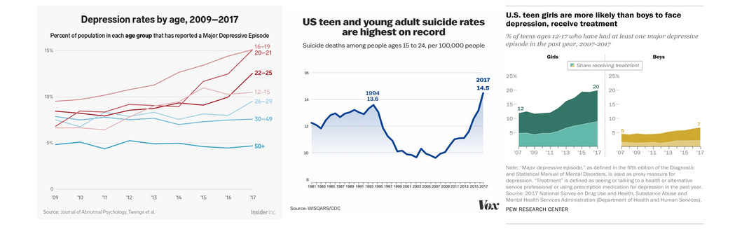 A second wave of rapidly increasing anxiety and depressive disorders hit us at around the time the iPhone was introduced and the mortgage bond bubble collapsed into the banking crisis [around which weighty and confusing government systems began pivoting rapidly, spiraling toward World War E]. This time, teens—and girls in particular—are feeling the greatest levels of increasing stress. Too many young people are spiraling out of control.
