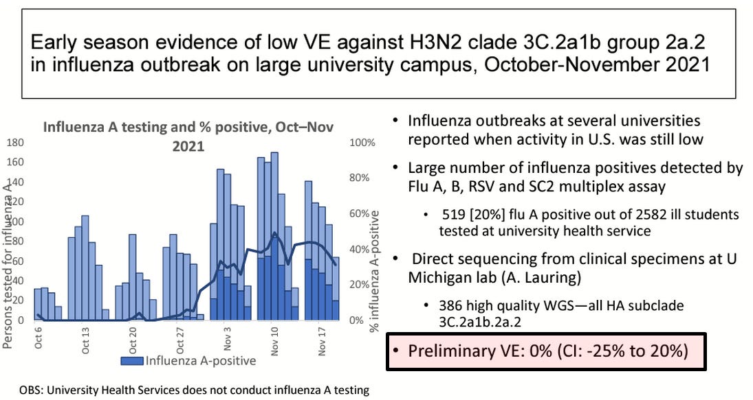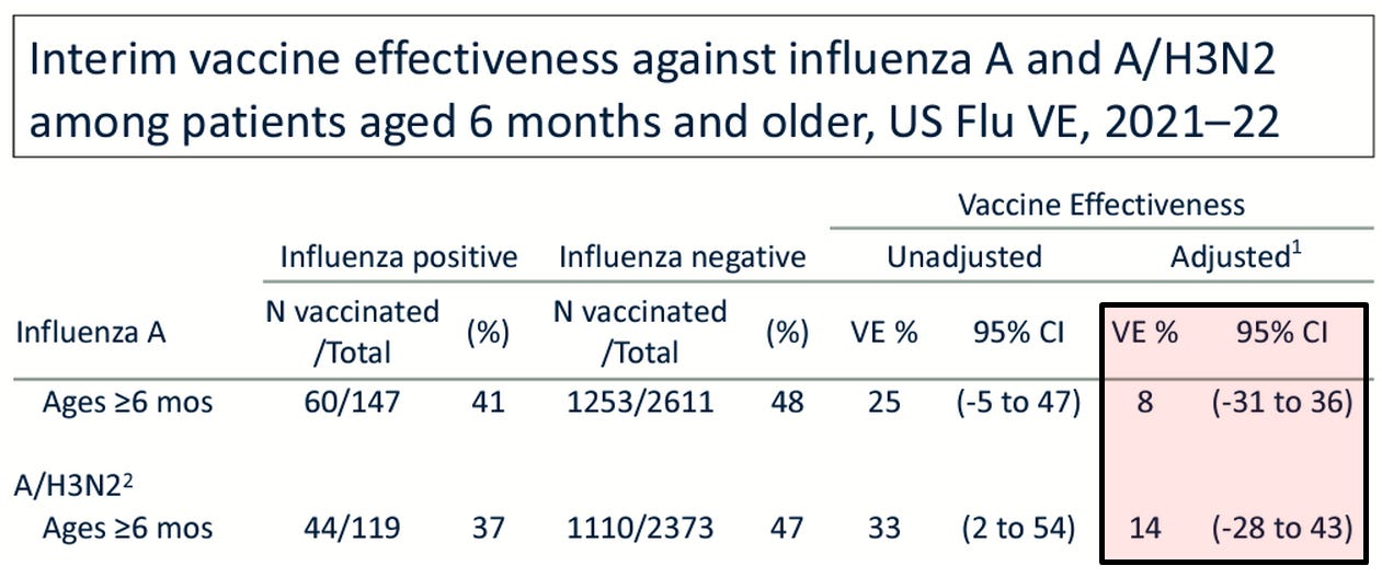 As Toby Rogers noted a few weeks ago, influenza vaccine efficacy already looks pretty crappy. You see, aggregated VE, just like any statistic produced from grouping demographics that differ by kind with respect to the functional risk variable(s), suffers from a Simpson's paradox, which has a one-way effect of making vaccines look more impressive than they otherwise are. From an ICAN letter to the VRBPAC: