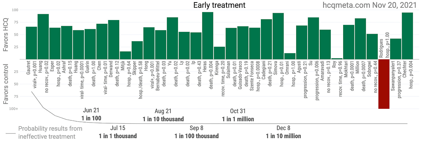 It may also derandomize the vaccine trials. While participants were sorted for a subset of conditions associated with immune dysfunction, they missed a lot of the most important conditions. Though to the degree it does derandomize the trials, I personally don't think it matters much, to be honest. With arms that size, the only thing that matters is that the deck wasn't stacked. In other words, I'm just as comfortable with OTCs and RTCs for most purposes---dependent upon trial design, of course. And since there was a negative all cause mortality benefit (H/T Alex Berenson for the update) in the Pfizer trial, the deck likely wasn't stacked. However, finding out that the Pfizer trials were not "well run RCTs" will give the RCT fundamentalists fits. They either have to now denigrate the vaccine trials, or accept the entirety of the vast mountain of hydroxychloroquine efficacy data (here, here, and here as well as several other places at RTE). Because...we all really believe they just sort of don't see that mountain.
